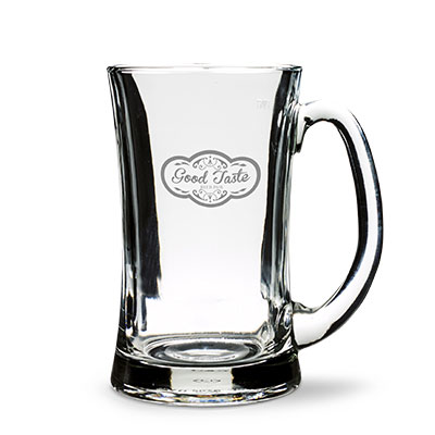 A massive tankard made of thick glass with a large handle and sides widening towards the top.