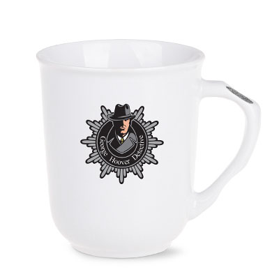 A porcelain advertising mug. The distinguishing feature of this design is the well shaped handle which makes for an excellent grip.
