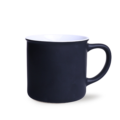 Small in appearance, but with a large capacity, ceramic mug with a black, matte outside surface and a colorful interior.