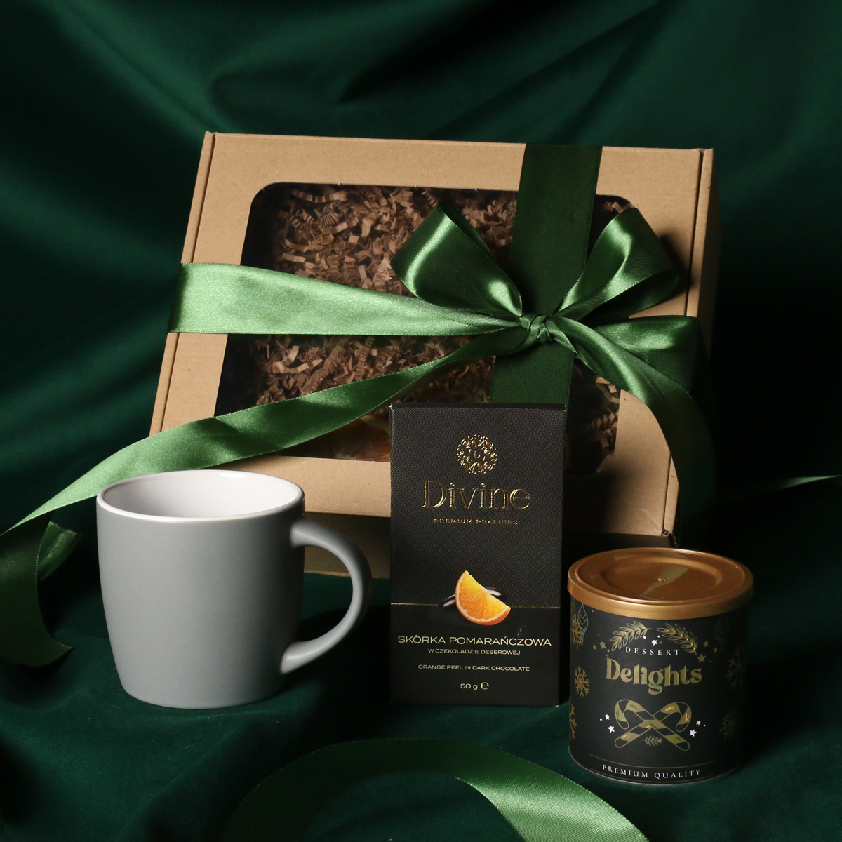 The set includes: Handy Velvet mug rose pink-white / baby blue-white / Handy Cool gray-white with the option of customization, Divine Pralines – almonds in chocolate with raspberry powder (pink) / almonds in chocolate with coconut (blue) / orange peel in dark chocolate (gray), Dessert Delights – blackcurrants in white chocolate with raspberry powder packed in a tube with a winter theme. All packed in a stylish eco cardboard box with a window. Additional customization options: print on the mug, company logo tag, ribbon or sleeve with a winter theme enriched with gold stamping.