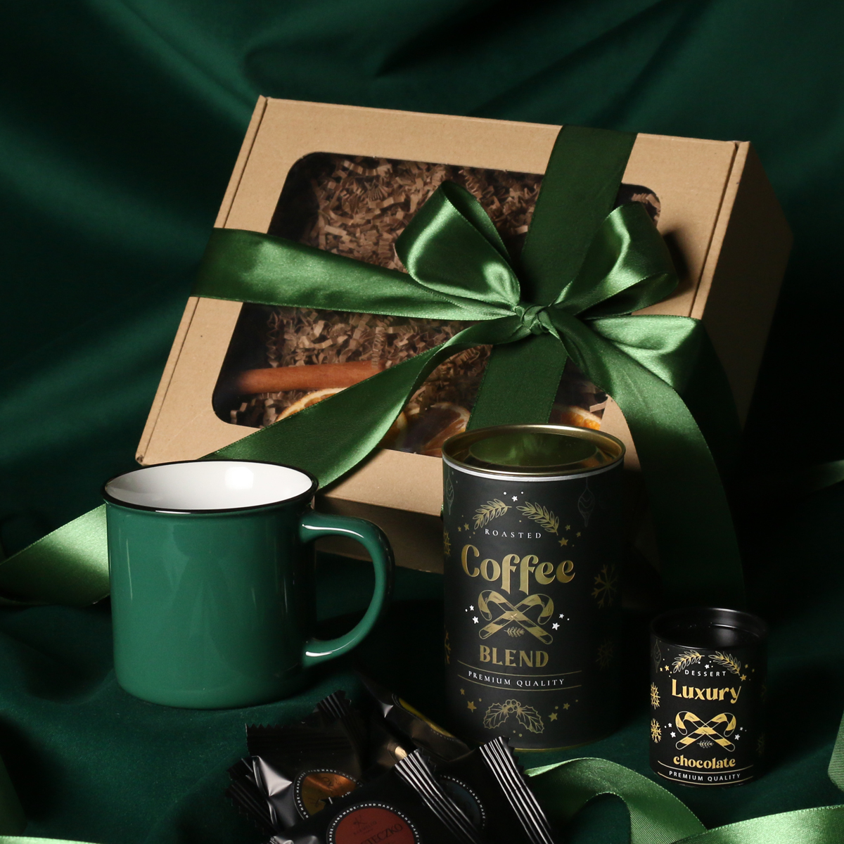 Loft mug in dark green or Loft Supreme in red and black Warming Belgian drinking chocolate 40g Aromatic Arabica Brazil Cerrado Mineiro coffee beans in a 150g tin Exclusive student cookies 8 pcs – assorted flavors Elegant packaging decorations: color-coordinated ribbon or banderole