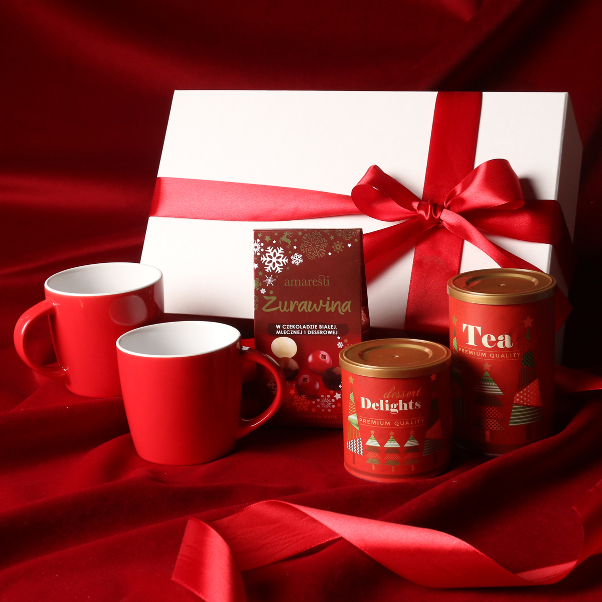 Iconic Handy mugs in red Cranberry pralines in white, milk, and dark chocolate Delicate Delights Pralines – blackcurrant in white chocolate with raspberry powder 80g Aromatic green Sencha tea with cherries, rose petals, and ginkgo biloba leaves 80g Exclusive magnet-closure packaging with the option to add a matching ribbon and banderole