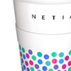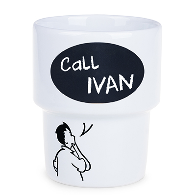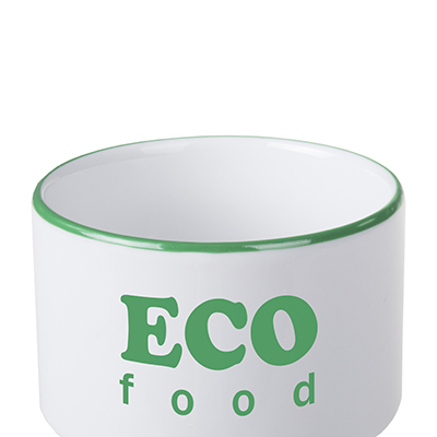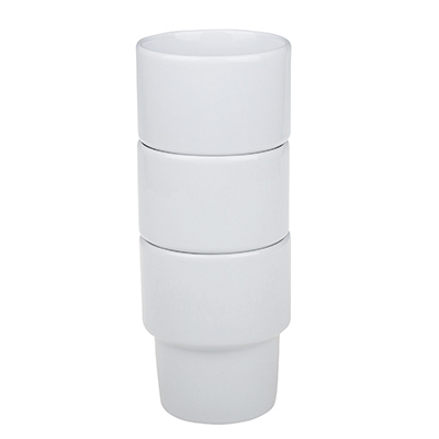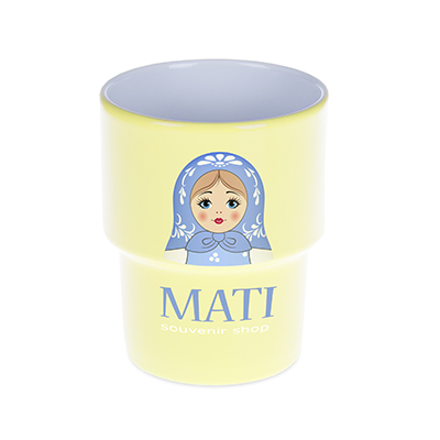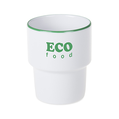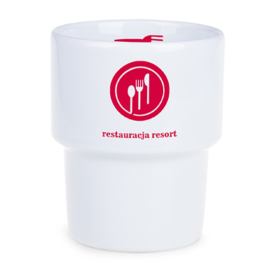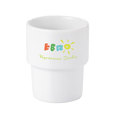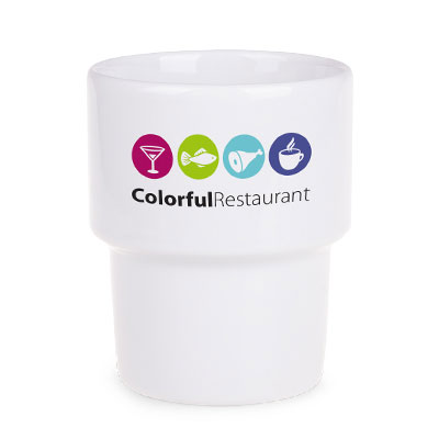 A medium sized porcelain advertising mug without a handle. The design allows for stacking. Notice: additional, insulation bands available (one 40mm wide band or two 20mm wide bands). Bands available in 7 colors: white, orange, red, green, dark blue, brown and black.
