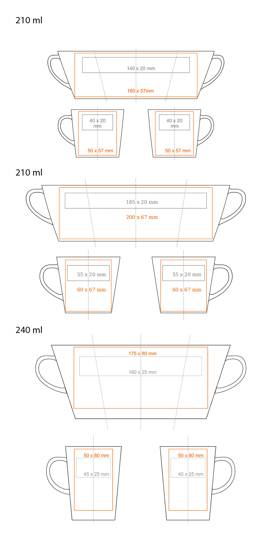An ergonomic, porcelain, cone-shaped mug. The design allows to apply large and complex advertising print.