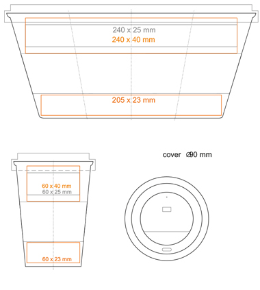 Print on the inside (40x20 mm) Print on the bottom outside (ø35 mm) Decoration with stripe Gold print Silver print Over the rim imprint Personal print |