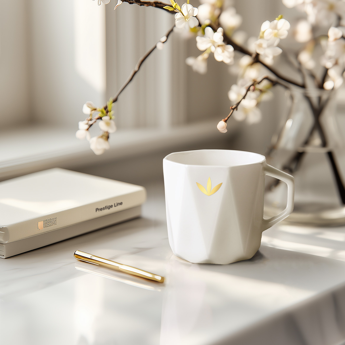 A prestigious mug made from top-quality Fine Bone China porcelain. It stands out with its unique geometric shape, resembling a diamond in its structure. A representative of the Prestige Line.