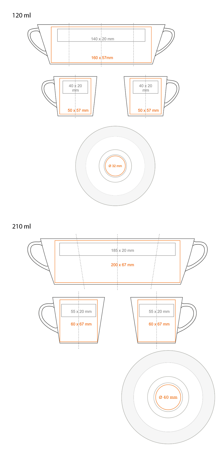 A cup with a simple, classic shape. Made of porcelain. It features an ergonomic handle and offers a large area for decoration. Available in two capacities