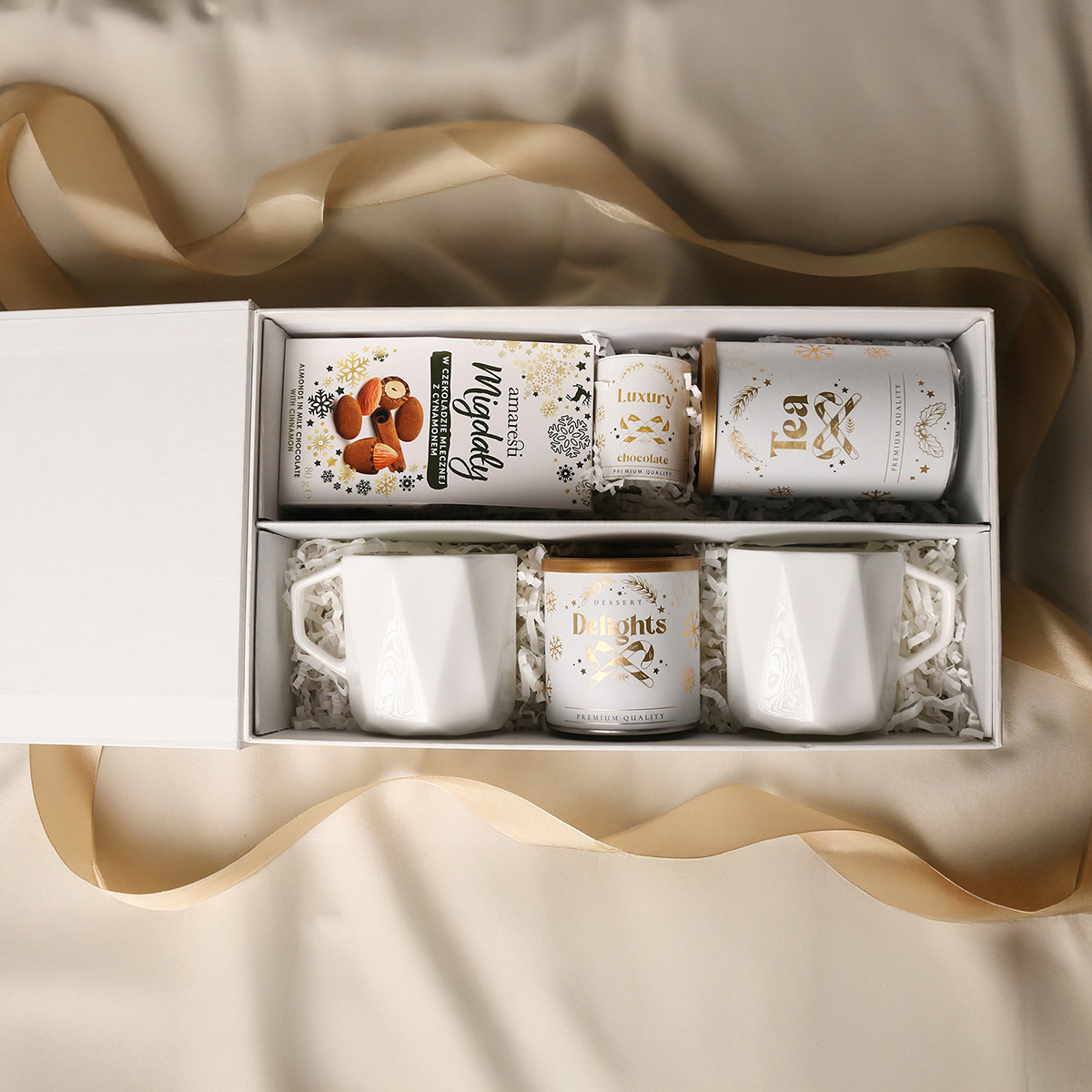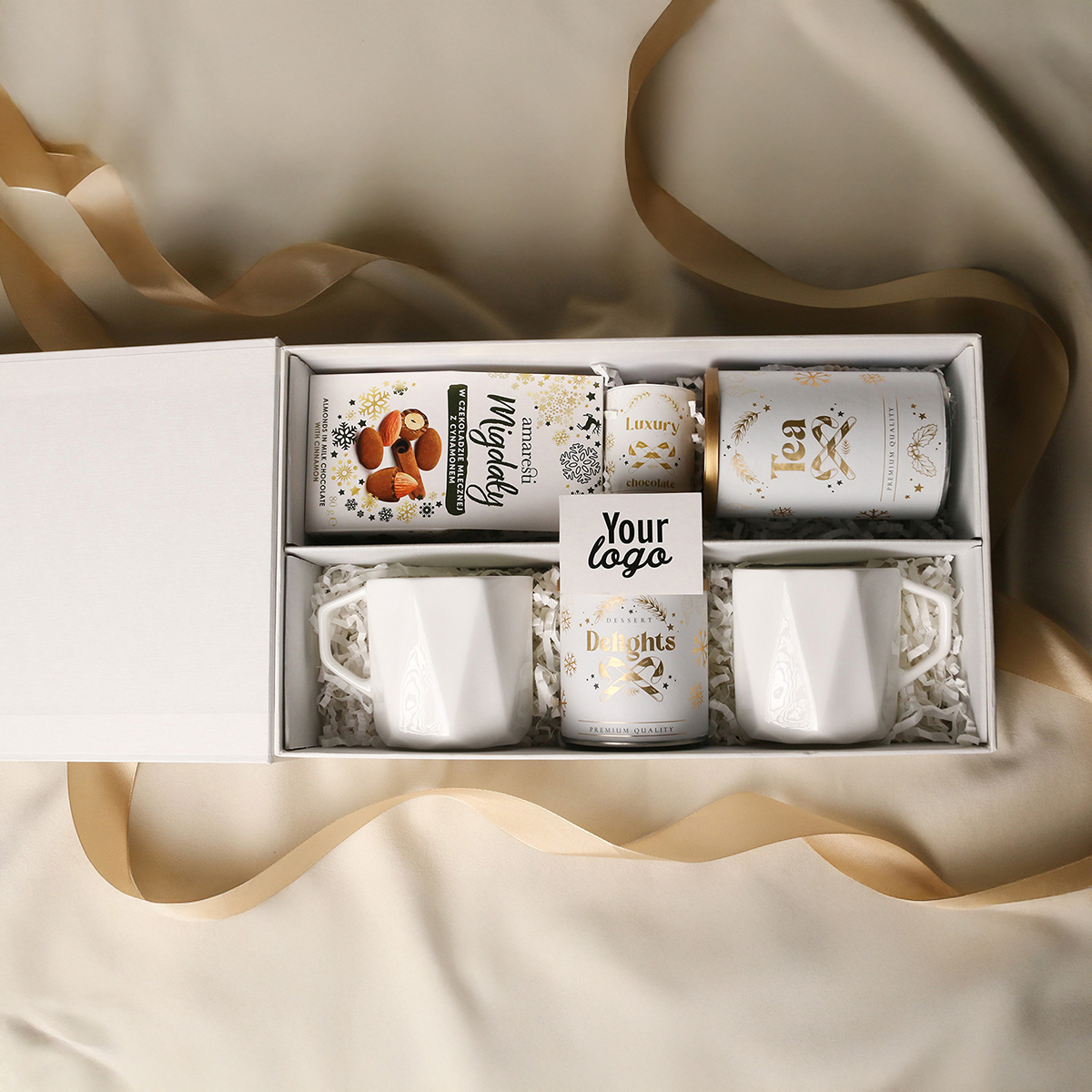 Exclusive Fine Bone China porcelain mugs – Crown – 2 pcs Sweet almonds in milk chocolate with cinnamon Delicate Delights Pralines – blackcurrant in white chocolate with raspberry powder 80g Aromatic green Sencha tea with cherries, rose petals, and ginkgo biloba leaves 80g Exclusive magnet-closure packaging with the option to add a matching ribbon and banderole